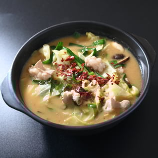 本場博多もつ鍋を、北海道らいしい味噌味のピリ辛ラーメンで再現、北海道産の牛もつのたっぷりの脂が滲み出て野菜に染み込みます。こってり好きの方にはたまりません!